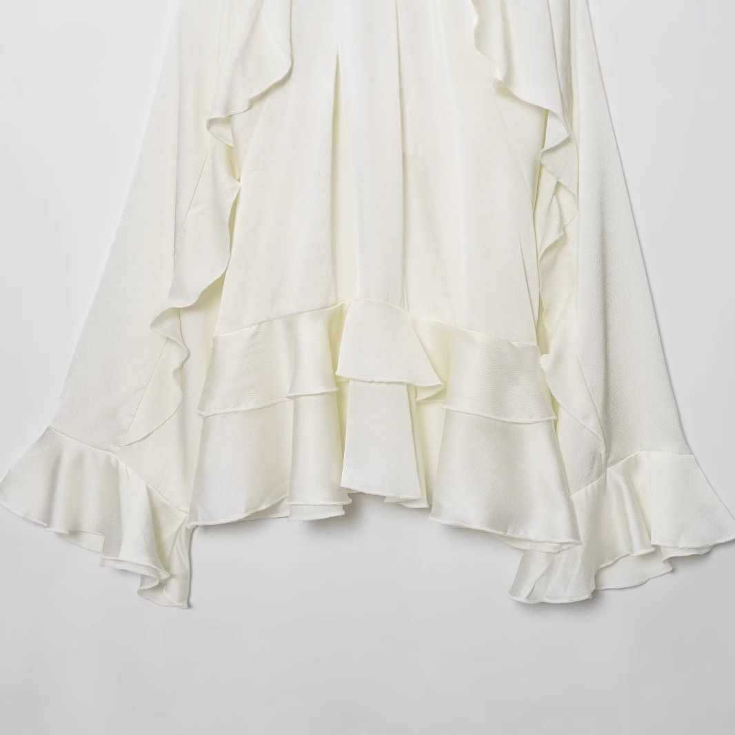 - Dekoracja z falbanek: Eleganckie falbany na rękawach i u dołu podkreślają kobiecy wygląd i nadają modny akcent.