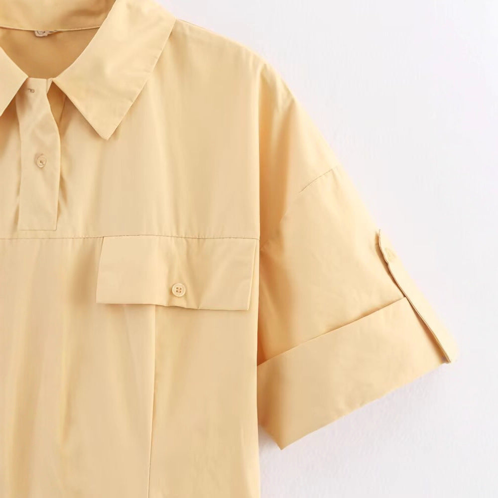 - Rękawy: Krótkie, odwracane rękawy dla swobodnego i jednocześnie eleganckiego wyglądu.