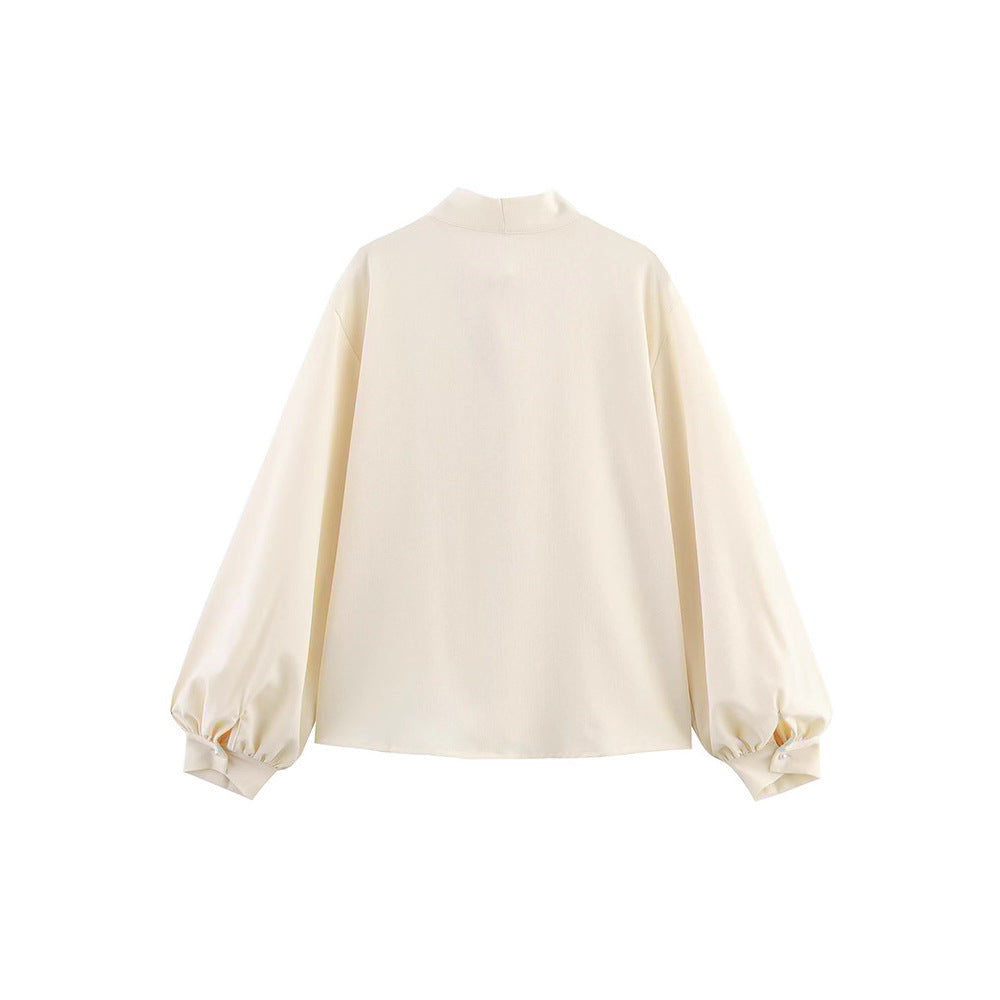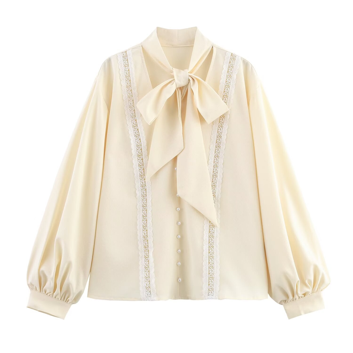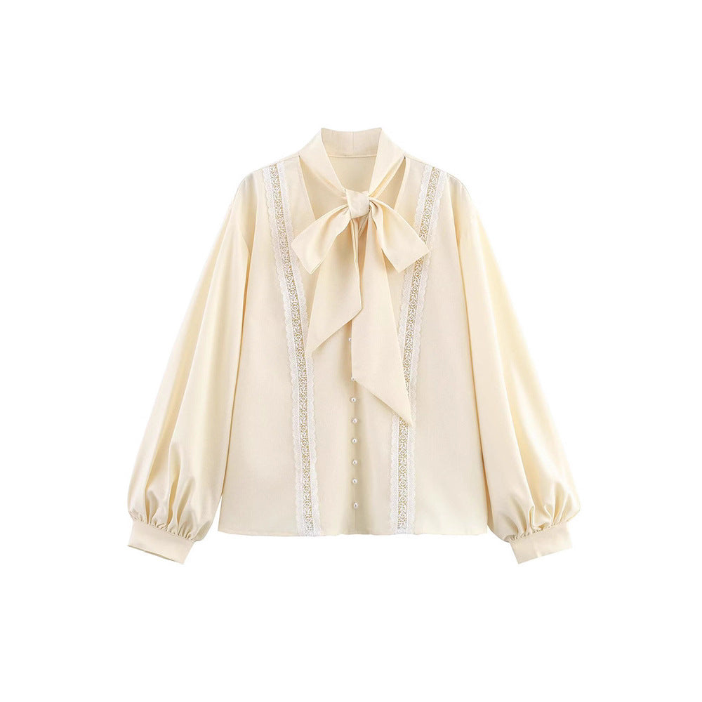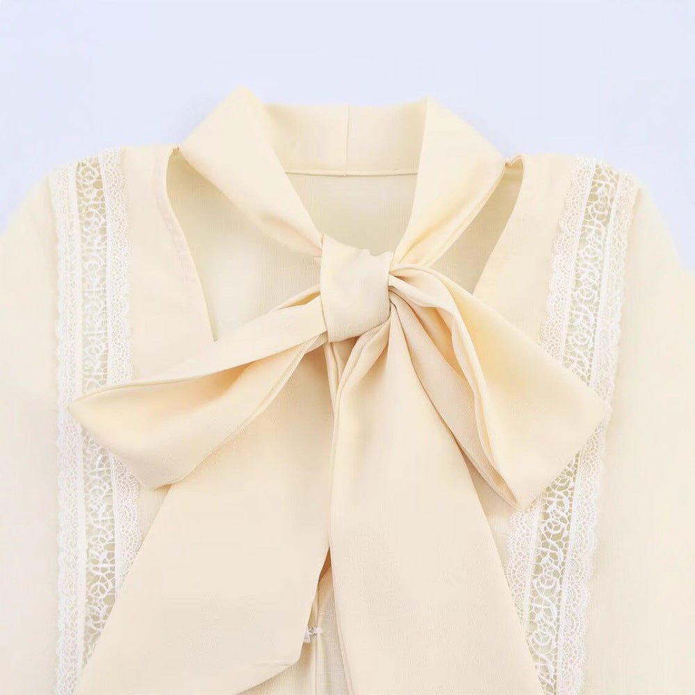 Damska bluzka z dekoracyjnym kołnierzykiem w kształcie wstążki i delikatnymi aplikacjami koronkowymi Eloura-Moda