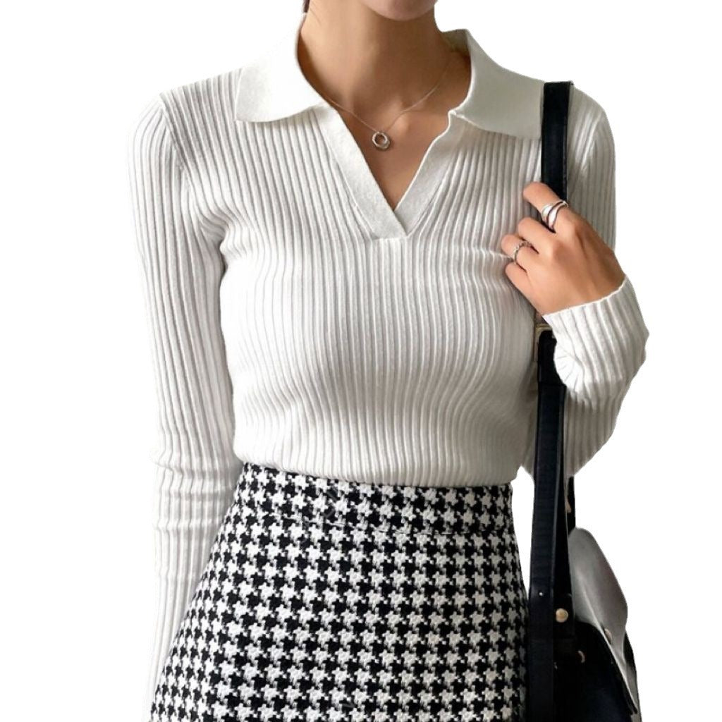 Damska bluzka z cienkiego dzianinowego materiału z kołnierzykiem polo i strukturą prążkowaną Eloura-Moda