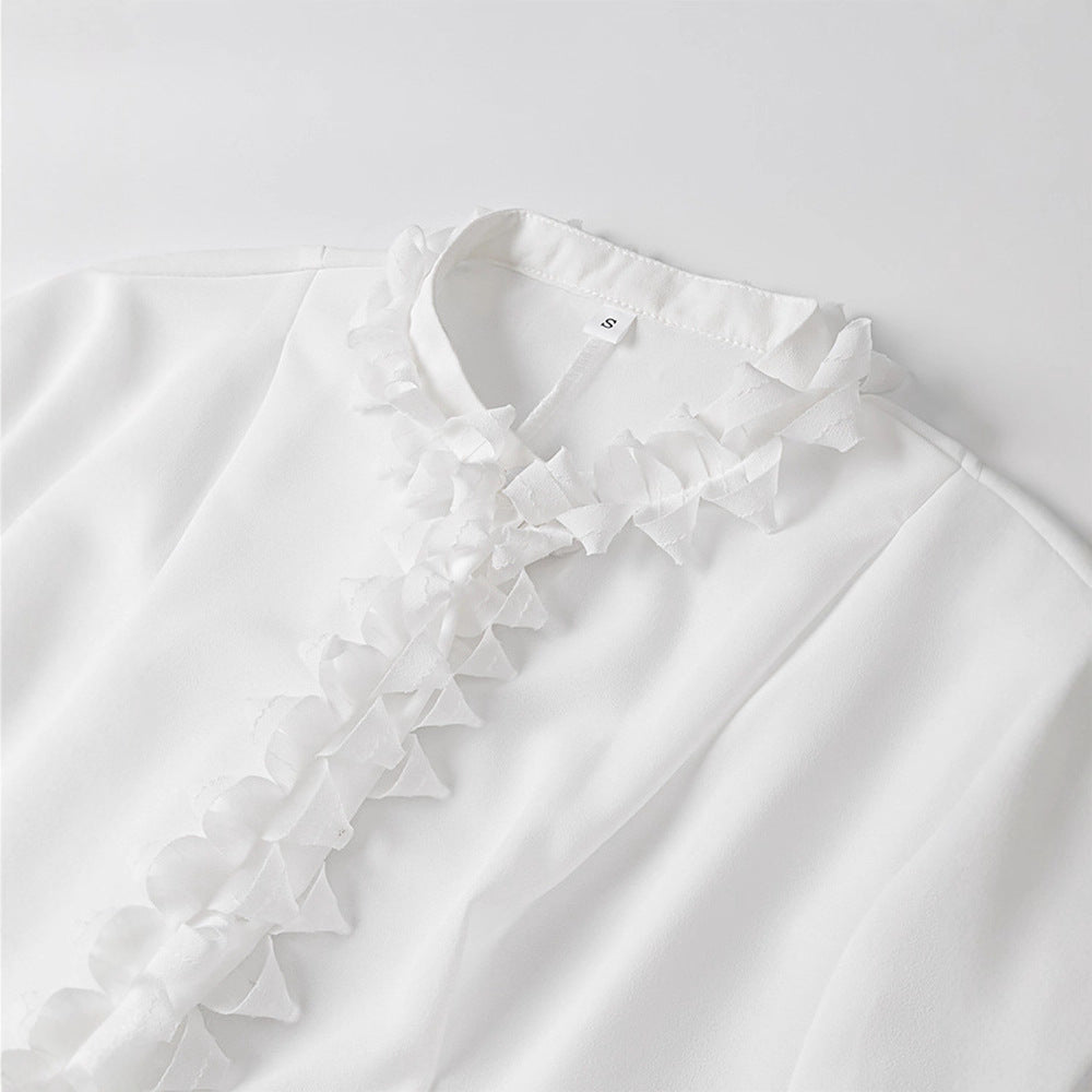 - Wyjątkowy design: Falbanki wzdłuż zapięcia na guziki nadają bluzce zabawny akcent i czynią ją unikalną.