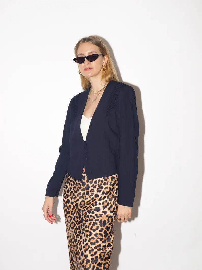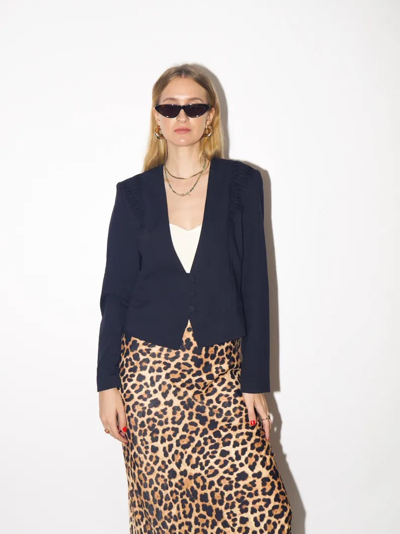 Ten ciemnogranatowy blezer, pochodzący z lat 80-tych, ma przycięty krój uzupełniony subtelnymi drapowaniami na ramionach. Jednorzędowy przód i klapy z wycięciami stanowią klasyczny akcent, a dopasowany krój i spiczasty dół podkreślają jego strukturalny wygląd. Wykonany z mieszanki wiskozy, dobrze komponuje się zarówno ze spodniami z wysokim stanem, jak i spódnicami midi, dzięki czemu jest wszechstronnym dodatkiem do każdej garderoby.