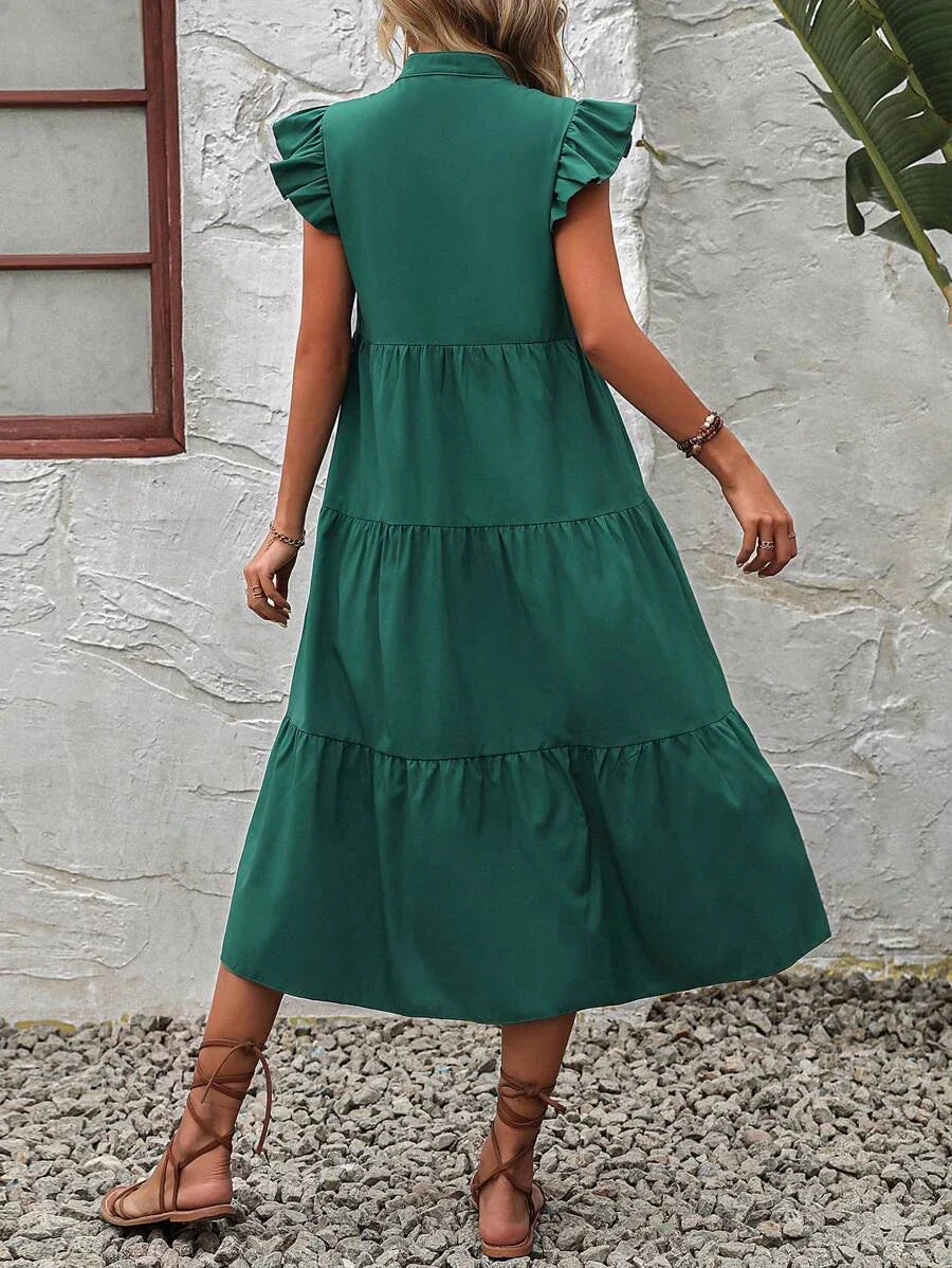Zielona sukienka midi o luźnym kroju to idealny wybór na ciepłe dni. Model bez rękawów z falbanami na ramionach i dekoltem w kształcie litery V prezentuje się lekko i kobieco. Rozkloszowany fason z trzema poziomymi marszczeniami dodaje jej romantycznego charakteru i zapewnia swobodę ruchów. Świetna na spacer, wakacje czy letnie spotkania – wystarczy dobrać kapelusz i sandały, by stworzyć stylową, codzienną stylizację.
